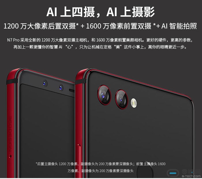 首次使用了前后四摄设计,其中后置1200万像素主摄像头,单个像素尺寸达到1.25um,光圈大小为f/1.8,副摄像头为200万像素专业景深摄像头。强大的硬件规格辅以AI智能深度学习算法、AI放模糊智能成片技术、AI智能曝光技术等功能,使得360手机N7 Pro的拍照性能显著提高。