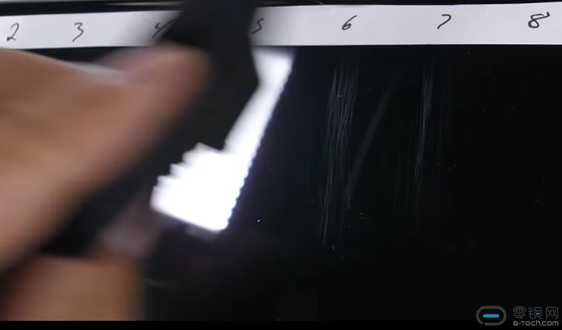 同时在暴力测试中,iPhoneXS屏幕的在使用莫氏硬度为6的硬物刻划的时候便出现了划痕。跟第五代大猩猩玻璃的表现一致,第六代大猩猩玻璃在耐刮性上确实也是与第五代大猩猩玻璃一致。