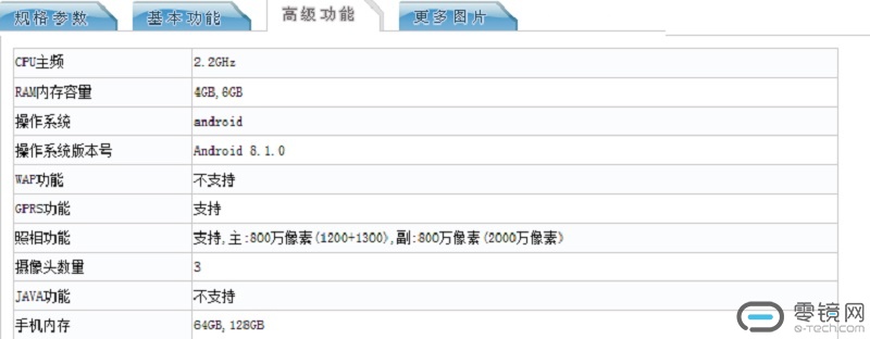 手机处理器采用主频为2.2GHz的8核处理器,预装安卓8.1系统。运存有4/6GB可选,内存有64GB/128GB可选。但值得一提的是,在主摄上是800万像素、1200+1300万像素,在副摄上是800万像素、2000万像素,不出意外的话这是一款5摄像头的手机。