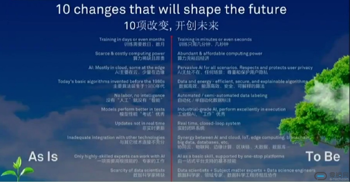 在10月10日启动的华为全联接2018大会上,华为轮值董事长表示虽然当前AI的发展令人感到兴奋,但是仍旧存在较大的落差。华为认为,要让人工智能真正改变人类的未来,当前人工智能必须做出10项改变。