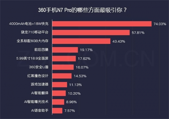 从调查数据中可以看到,消费者对于360手机N7 Pro最感兴趣的三个点分别是:4000mAh电池+18W快充、骁龙710移动平台、全系标配6GB大内存。此外,360手机N7 Pro的前后四摄、5.99英寸18:9全面屏、360安全U盾、红黑撞色设计、游戏加速器以及多项AI技术也吸引了不少消费者的关注,整体来说,360手机N7 Pro是一款2000元价位上非常接近“水桶机”定位的产品。