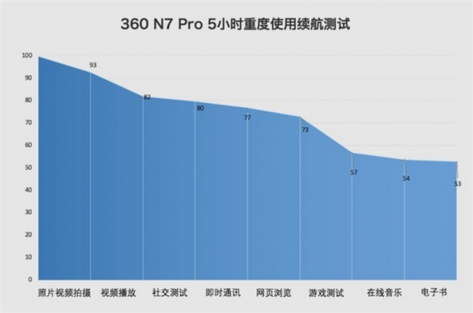在实测环节中,已经有科技媒体对360手机N7 Pro进行了全方位的续航能力测试,评测选用了两种测试方法:5小时续航测试和GeekBench 4局部放电测试。5小时续航测试是指,在满电情况下,使用一半的屏幕亮度和音量,清空后台程序,按顺序进行拍照、视频播放、刷微博、使用微信、浏览网页、手机游戏、听音乐以及阅读电子书等操作,并记录每个节点的剩余电量,测试时长5小时。实际测试下来,360手机 N7 Pro剩余电量为53%,这个续航成绩十分优秀,能满足我们一天的重度使用。