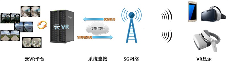 在5G云VR平台架构中,所有的VR应用均运行在云端,利用云端的强大计算能力和显卡的渲染能力实现VR应用运行结果的处理,云端运行的画面和声音经过低时延编码技术的处理,形成实时的内容流。实时流通过网络发送到VR终端,实现低时延解码并呈现于VR显示设备上。同时VR显示设备将用户的控制信令发送到云端用于操控应用,实现用户与应用的互动。基于云VR平台架构,VR应用运行与应用展现是相分离的,云端完成应用处理和结果下发,VR眼镜仅需要实现最基础的视频解码、呈现、控制信令接收和上传,而不需要处理与实际业务相关的计算,大大简化了VR眼镜的内部结构和性能需求。