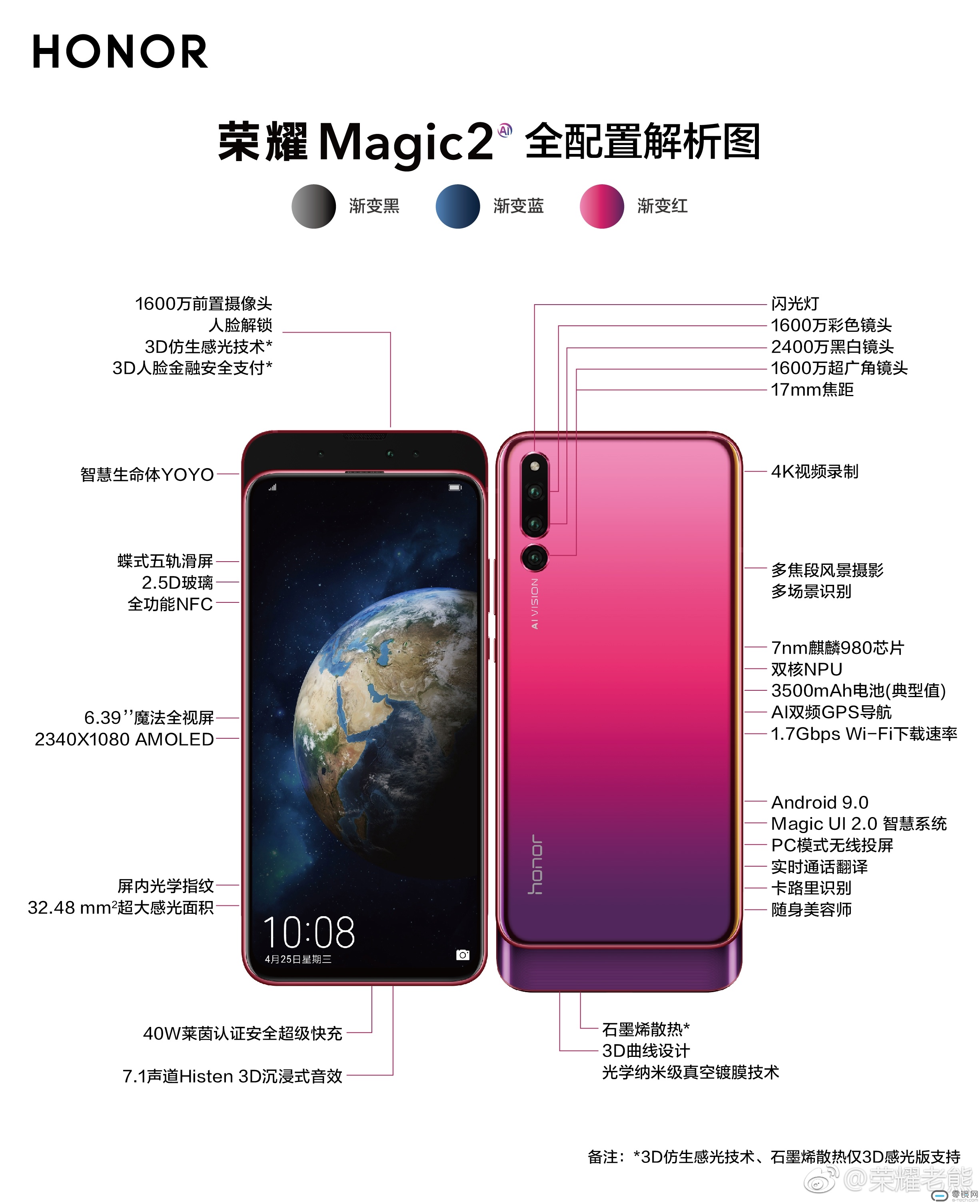 荣耀Magic2配备了一块6.39寸的所谓“魔法全视屏”,AMOLED材质,分辨率2340×1080,高对比度,108% DCI-P3色域,通过蝶式五轨滑屏结构实现了几乎100%的屏占比,而滑开之后可以启动前置摄像头,包括一个1600万像素主镜头和两个红外镜头,支持人脸解锁、3D仿生感光技术和3D人脸金融安全支付(仅限顶配版)。