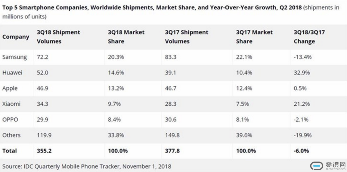 根据国际数据公司(IDC)最新的调查数据显示,2018年第三季度全球智能手机出货量为3.552亿部,同比下降了6.0%。这是全球智能手机市场连续第四个季度出现同比下滑。