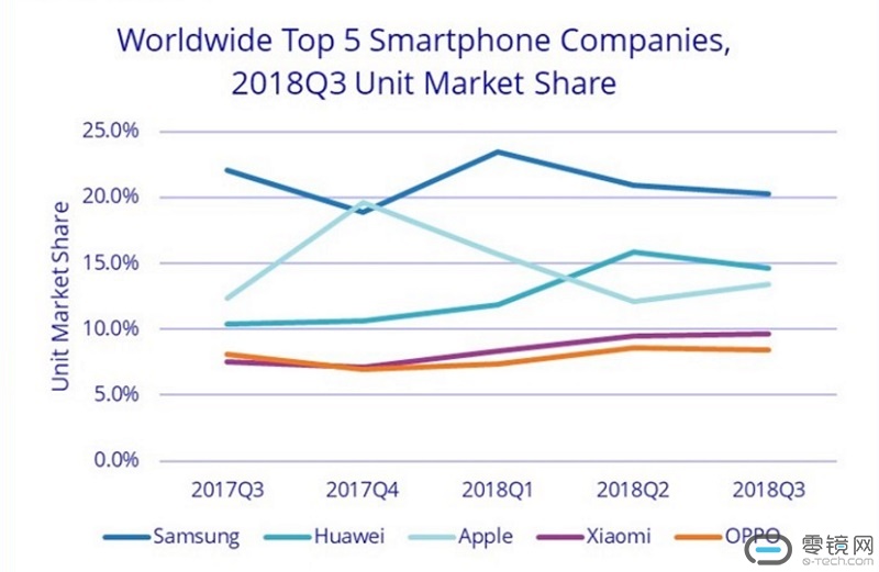 虽然整体智能手机市场已经连续四个季度下滑,但在第三季度有两个因素成为主要因素。三星是市场份额最大的智能手机供应商,占第三季度出货量的20.3%,同比下降13.4%。其次,作为智能手机消费的最大市场中国,占全球出货量的约三分之一,连续第六个季度下降。