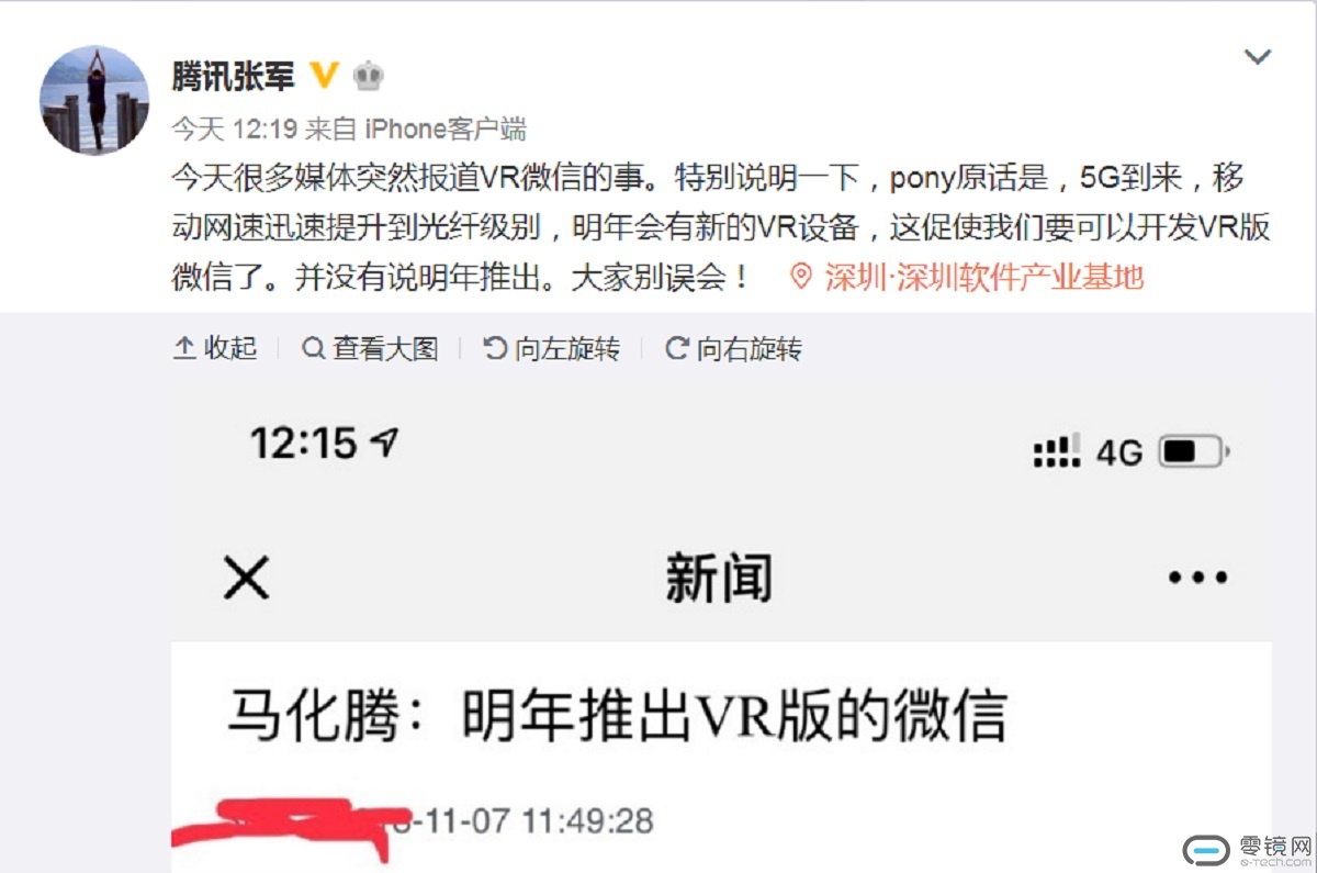但随后部分媒体在报道时直接称之为腾讯将于2019年开发VR版微信。对此,腾讯张军进行了辟谣,表示“pony原话是,5G到来,移动网速迅速提升到光纤级别,明年会有新的VR设备,这促使我们要可以开发VR版微信了。并没有说明年推出。”