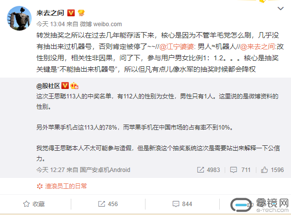 有网友在中奖名单中挨个查看,统计出了非常惊人的事情。根据微博资料显示,113人的中奖名单,112名女性微博用户,仅一名男性用户。同时,这些用户中,苹果手机使用者占比78%,但是苹果手机在智能手机市场的占有率其实不到10%。这样的数据确实不那么合理,于是微博CEO来去之间出面解释了。