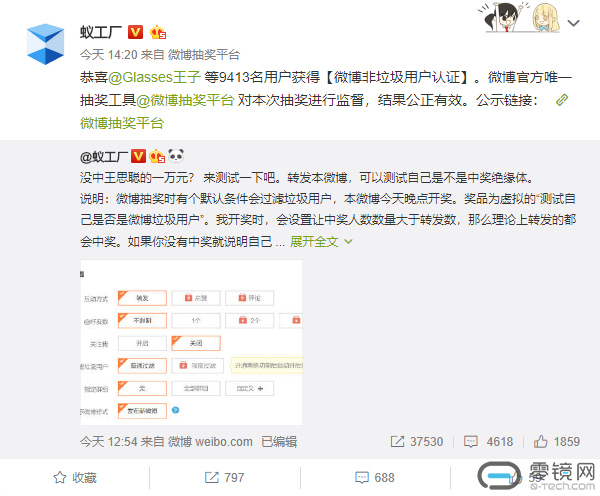 为了验证微博的的抽奖系统(当然也有为了增粉),很多博主开始了虚拟抽奖。按照微博的规定,一次抽奖最多能够有两万的中奖用户。所以这些博主直接设置20000万人中奖人数,在人数两万的时候抽奖,按道理来说,只要不是垃圾用户,便都能够中奖了。当然,抽奖的奖品就是一个称号,微博非垃圾用户认证!