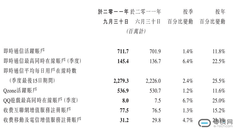 在2011年第三季的财报中,QQ仍然是当之无愧的主角。但是腾讯已经意识到互联网的整体放缓,“随着中国互联网整体用户基数的规模真是够大及增长放缓,即时通信平台的主要营运指标的按年增长继续放缓。”腾讯的Qzone(QQ空间),QQ农场、QQ牧场等游戏也因为互联网发展以及平台的成熟而增速放缓。此时的腾讯已经看到了移动互联网的先机,并且在尝试推广自己的手机应用,包括手机版QQ及微信等。但此时的微信仍旧是一个新生事物,暂时仍无法与经过多年沉淀的QQ相比。即便出现在财报中,也只是作为附属项而出现。