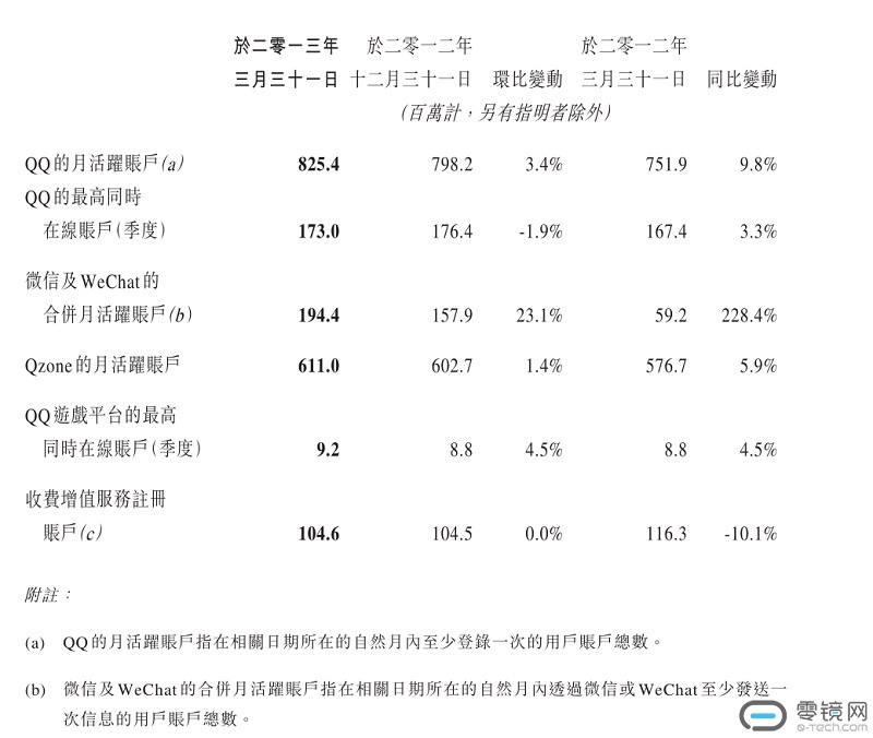 很快,微信用另外一种更为显目的方式出现在了腾讯的财报中。在2013年第一季度的财报中,腾讯首次将微信及WeChat合并月活跃账户以报表的方式呈现在人前。微信及WeChat月活跃账户数达到1.944亿,环比增长23.1%,同比增长228.4%。虽然用户数仍旧不及QQ月活跃账户,甚至不敌Qzone的月活跃账户,但是同比爆增228.4%的数字,足以说明其潜力。在当季财报中,腾讯表示,如此迅猛增长主要是基于微信的创新功能,以及WeChat在东南亚地区的强势增长。