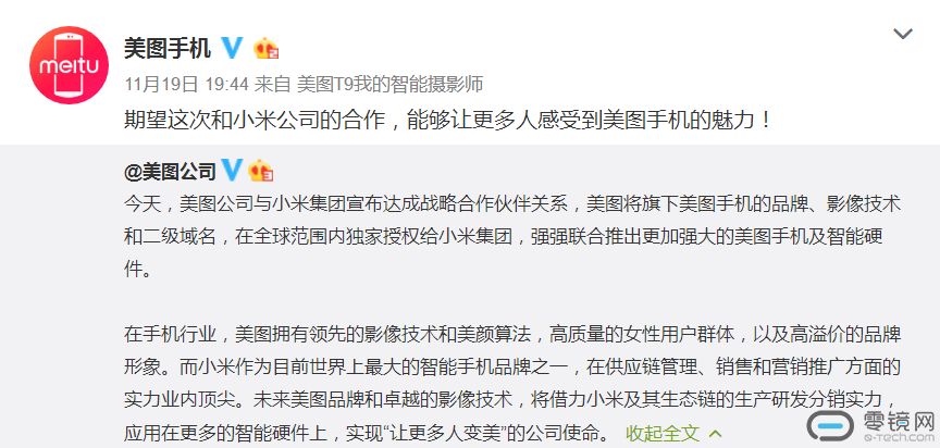 11月19日晚间,美图公司突然官宣与小米达成战略合作。“美图将旗下美图手机的品牌、影像技术和二级域名,在全球范围内独家授权给小米集团,强强联合推出更加强大的美图手机及智能硬件。”