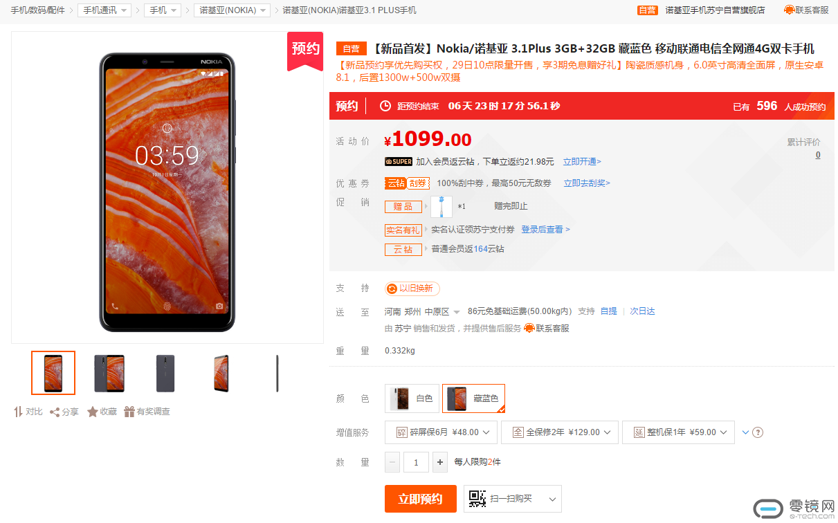 诺基亚3.1 Plus国行版正式发布,售价1099元。