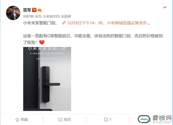 12月4日消息,小米科技创始人兼CEO雷军宣布,小米米家智能门锁将于12月5日下午14:00在小米商城直播众筹发布 ,这是一款配有C级智能锁芯、功能全面、体验出色的智能门锁,而且把价格做到了极致。