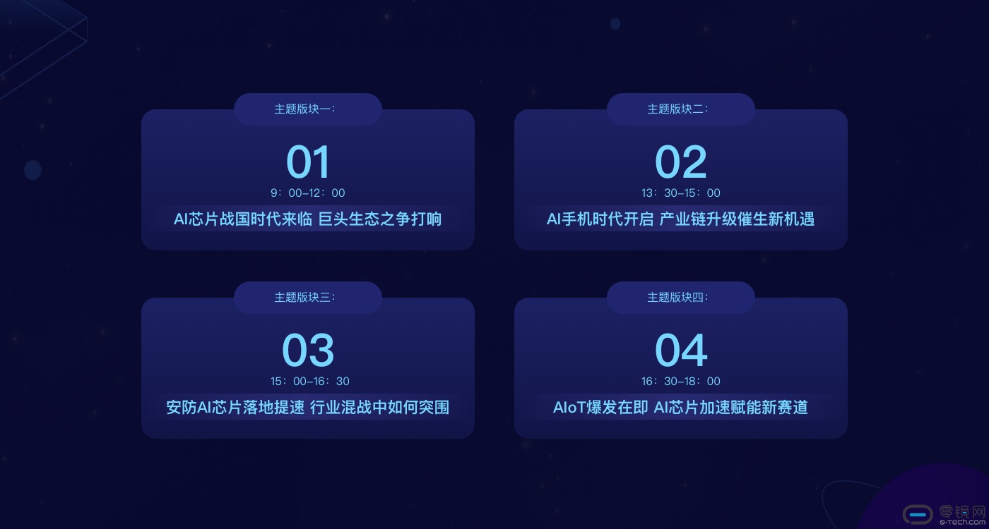 四大主题版块分别是”AI芯片战国时代来临 巨头生态之争打响”、“AI手机时代开启 产业链升级催生新机遇”、“安防AI芯片落地提速 行业混战中如何突围”和“AIoT行业爆发在即 AI芯片加速赋能新赛道”。