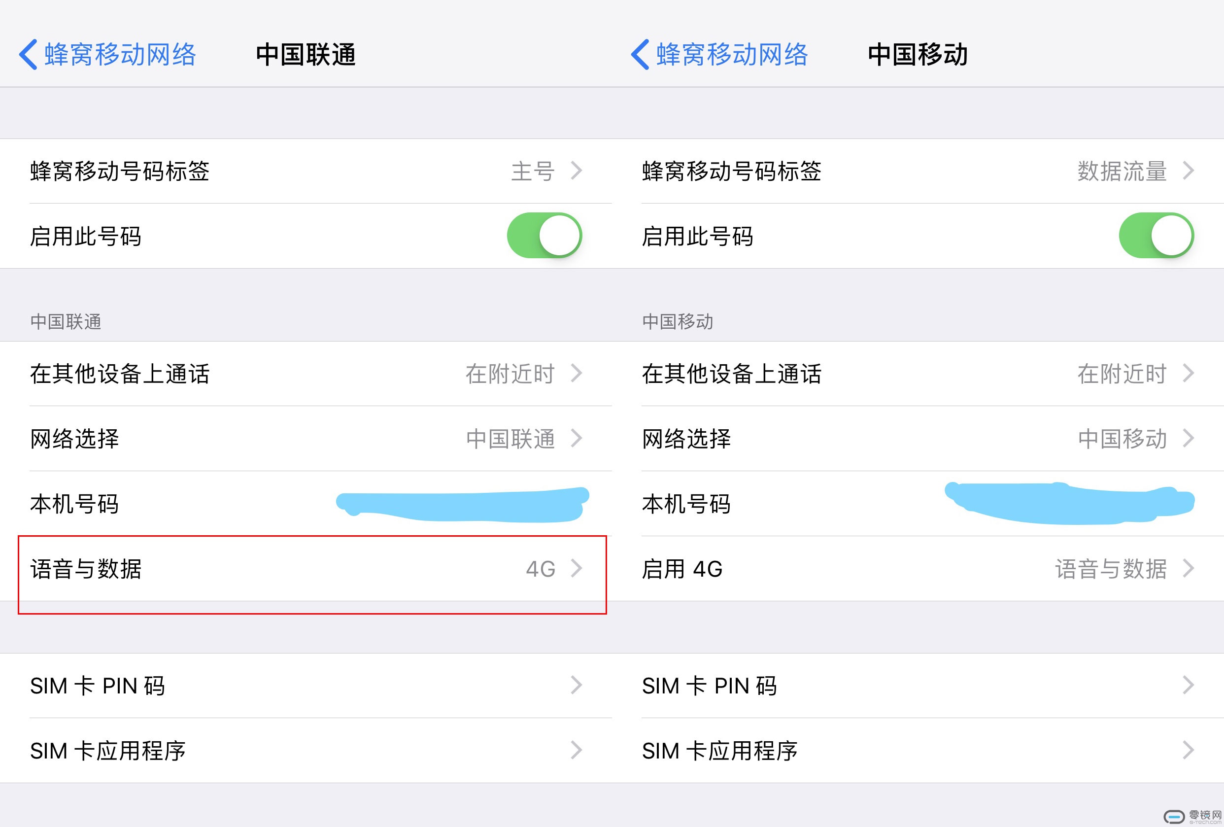 更新之前,XS Max的双卡管理界面是这样的。仅数据流量的卡可以4G,另外一张联通卡便最多开启3G,否则只能2G状态。