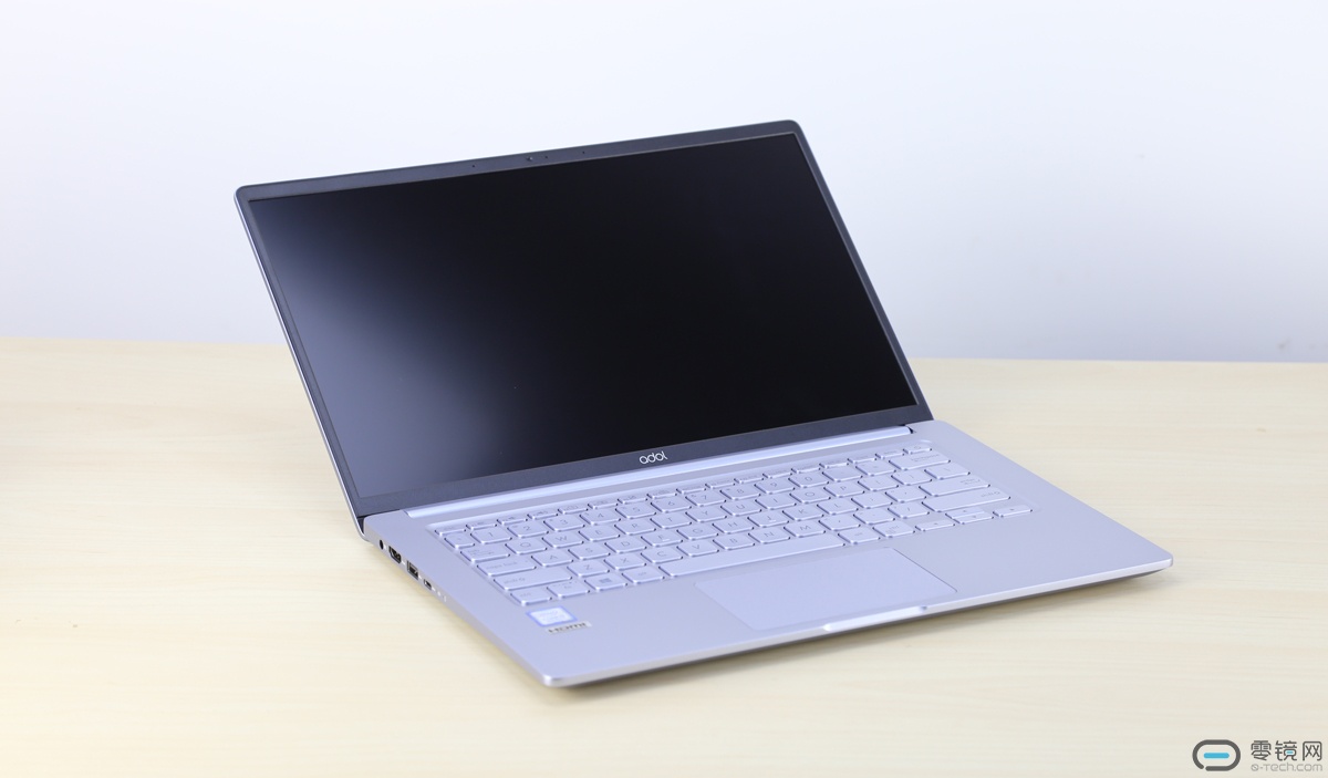 零镜网拿到的是银蓝灰版本的adol笔记本14,它采用了全金属机身的设计,机身泛发着银色光泽。A面adol的Logo镶嵌于金属面板中,采用与机身不同的材质,在光线照射下显出十分漂亮的镜面效果。