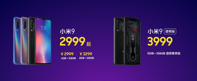 小米9 6+128GB版2999元,8+128GB版3299元。小米9透明尊享版,12GB+256GB至尊配置3999元。