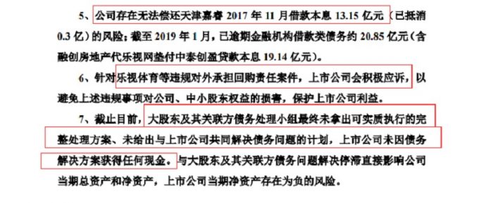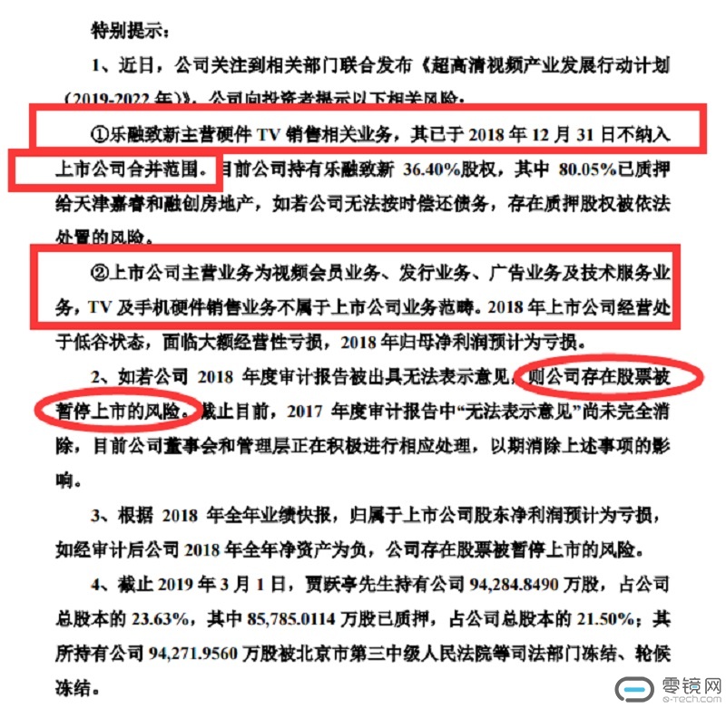 3月4日晚间,乐视网发布《关于股票存在被暂停上市风险的提示性公告》,公告显示,乐融致新主营硬件TV销售相关业务,其已于2018年12月31日不纳入上市公司合并范围。目前公司持有乐融致新36.4%股权,其中80.05%已质押给天津嘉睿和融创房地产,如若公司无法按时偿还债务,存在质押股权被依法处置的风险。