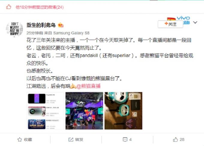 实际上,iPanda熊猫频道与熊猫直播并无任何关系。如果有的话,关系就是都在自己的名字中加了“熊猫”二字。而熊猫直播目前仍旧没有在官方微博上回应倒闭传闻,仅仅在数十分钟前点赞了与熊猫直播告别的微博。江湖路远,就是不知道后会有没有期。