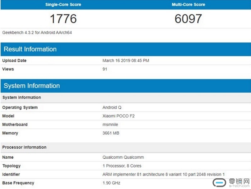 其搭载的内存显示只有4GB,而上一代的Pocophone F1起步是6GB RAM。其次,该机主板虽然显示为“msmnile”,意味着其搭载骁龙855移动平台;但是跑分显示,该机单核得分为1776、多核得分为6097,和其他骁龙855手机上万的多核跑分差距较大。