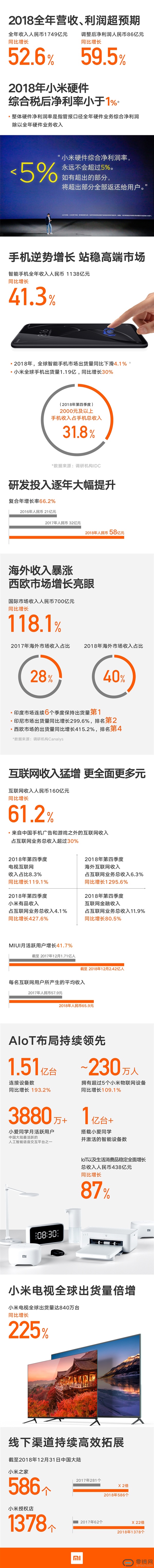 小米在2018年收入1749亿元,同比增长52.6%,经调整利润86亿元,同比增长59.5%,而包括手机、IoT和生活消费品等智能硬件在内,2018年小米硬件综合税后净利润率小于1%,可以说兑现了雷军此前所说的不超过5%的承诺。那么小米全年财报情况到底如何?答案就在下列图表中。