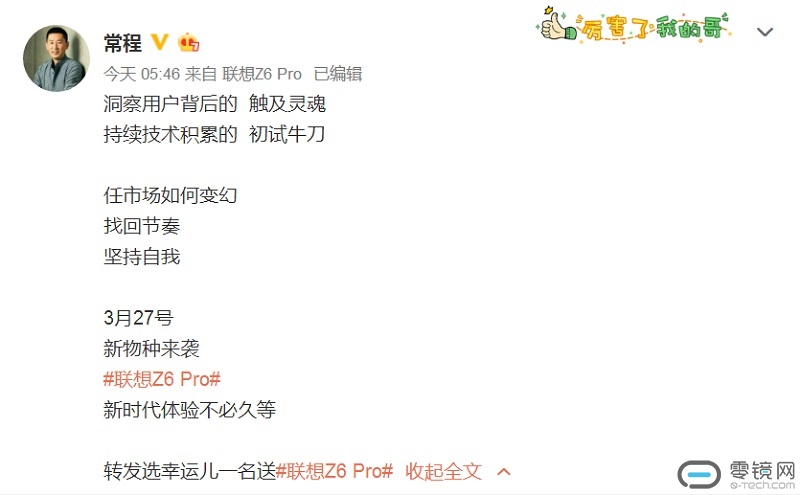 新闻 常程又发新文案,联想27日出新机 作者 Hansen.Z - 2019年3月25日 今天一早,联想常程在微博上发布了新的宣传文案。表示将于27日发布新机Z6 Pro。文案是这样写的:洞察用户背后的 触及灵魂 持续技术积累的 初试牛刀任市场如何变幻找回节奏坚持自我 习惯了常掌柜的人可能对此已经见怪不怪了。至于Z6 Pro的真相,似乎这张宣传图上什么都没说。或许,“吹风机”造型是想说明核心处理器是骁龙最新旗舰。但这不过是我们的猜测,毕竟“宇航员”已经飞上了天。 至于Z6 Pro真相如何,等到27号就揭晓答案了。