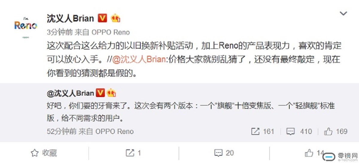沈义人在微博爆料,Reno会有两个版本,一个“旗舰”十倍变焦版、一个“轻旗舰”标准版,给不同需求的用户。 ????在随后也对价格爆料等予以驳斥,表示并未最终敲定。甚至十分自豪地表示,“这次配合这么给力的以旧换新补贴活动,加上Reno的产品表现力,喜欢的肯定可以放心入手。”