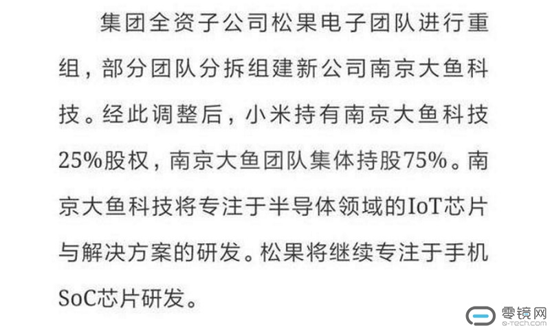 4月2日,小米集团组织部发布组织架构调整邮件,小米旗下全资子公司松果电子团队进行重组,其中部分团队分拆组建新公司南京大鱼半导体,并开始独立融资。