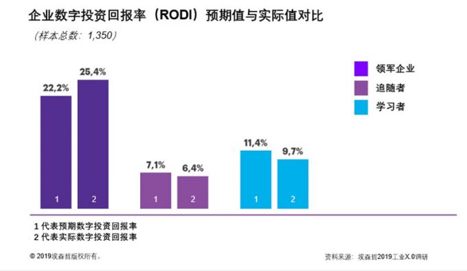 调研显示,领军企业(占样本量的22%)已对其超过半数的概念验证进行规模化实施。这些企业期望自身行动所产生的回报高于同行,同时他们不仅能普遍达到其高预期,而且往往可以超出预期。埃森哲的调研发现,平均来看,领军企业预期的数字投资回报率(Return on Digital Investment – RODI)为22.3%,但实际最终可达25.5%。