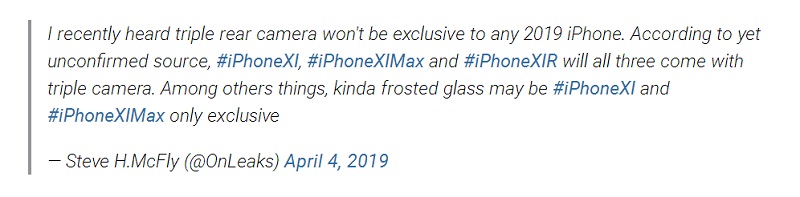 OnLeaks表示iPhone XI、iPhone XI Max、iPhone XIR都将采用三摄。但是冰冻玻璃的背面设计仅仅将存在于iPhone XI和iPhone XI Max上。