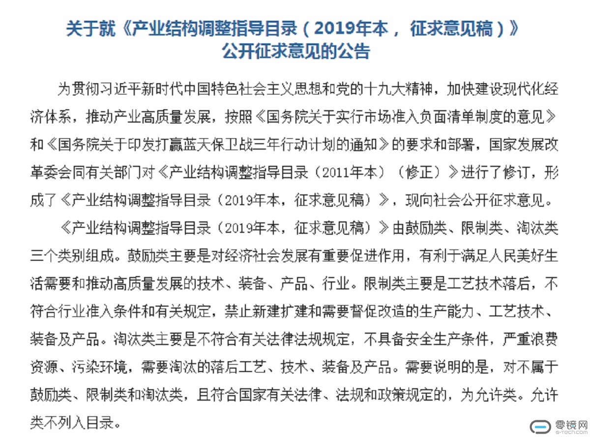 国家发展改革委会在4月8日发布了一份公告,在同有关部门对《产业结构调整指导目录(2011年本)(修正)》进行了修订,形成了《产业结构调整指导目录(2019年本,征求意见稿)》。