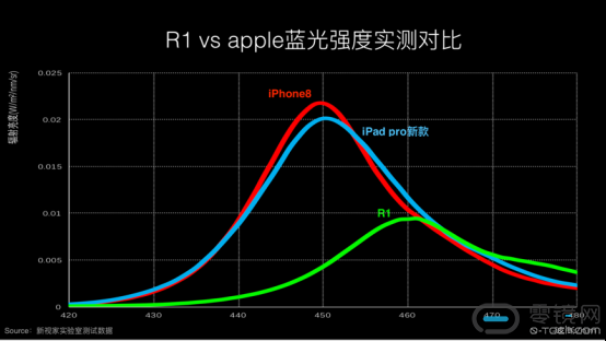 首先,凭借此前在电视硬件领域多年的技术积累,新视家的技术团队从根本上来改变屏幕发光的设计,尽可能减少蓝光照射,降低屏幕发出的光线里的蓝光含量。通过R1与iPhone8和新款iPad Pro进行的蓝光强度实测对比,结果显示R1远低于苹果的两款产品。