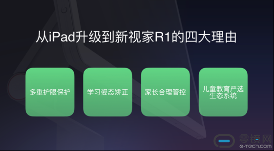 R1相对于iPad拥有多重护眼保护、学习姿态矫正、家长合理管控、儿童教育严选生态系统四大优势。