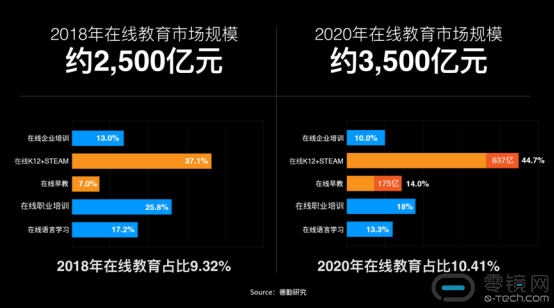 根据德勤教育行业、德勤研究以及德勤风险咨询、财务咨询和管理咨询团队联合编纂的《中国教育发展报告2018》显示:2018年中国教育市场规模将达到人民币2.68万亿元,至2020年教育的总体规模将达到3.36万亿元。其中,2018年在线教育市场规模约2500亿元,占比9.32%;至2020年在线教育市场规模约3500亿元,占比10.41%。而围绕在线K12、素质教育和启蒙早教市场规模三年就从1100亿到了2000亿,几乎翻了一倍。