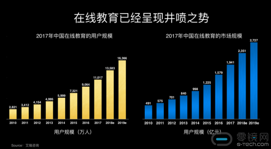 另据艾瑞咨询数据显示,2017年中国在线教育用户规模达到1.1亿人,预计2019年用户有望达到1.63亿人,2017年中国在线教育市场规模达1941亿元,预计在2019年其市场规模将达2727亿元。
