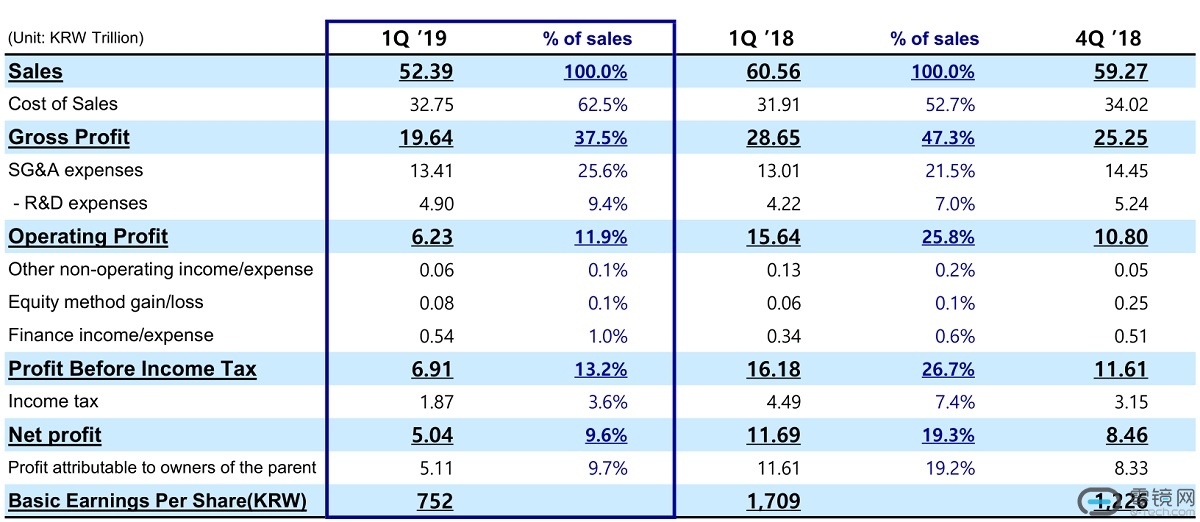 事实上,早在4月5日,三星电子就发布了指导性公告,对第一季度财报进行了预期。但是并没有公布各个板块具体营收。如今三星电子正式公布了2019年第一季度财报。财报显示三星第一季度营收为52.4万亿韩元(约合451.8亿美元),同比下降13.5%;净利润为5.04万亿韩元(约合43.5亿美元),同比下降56.9%。