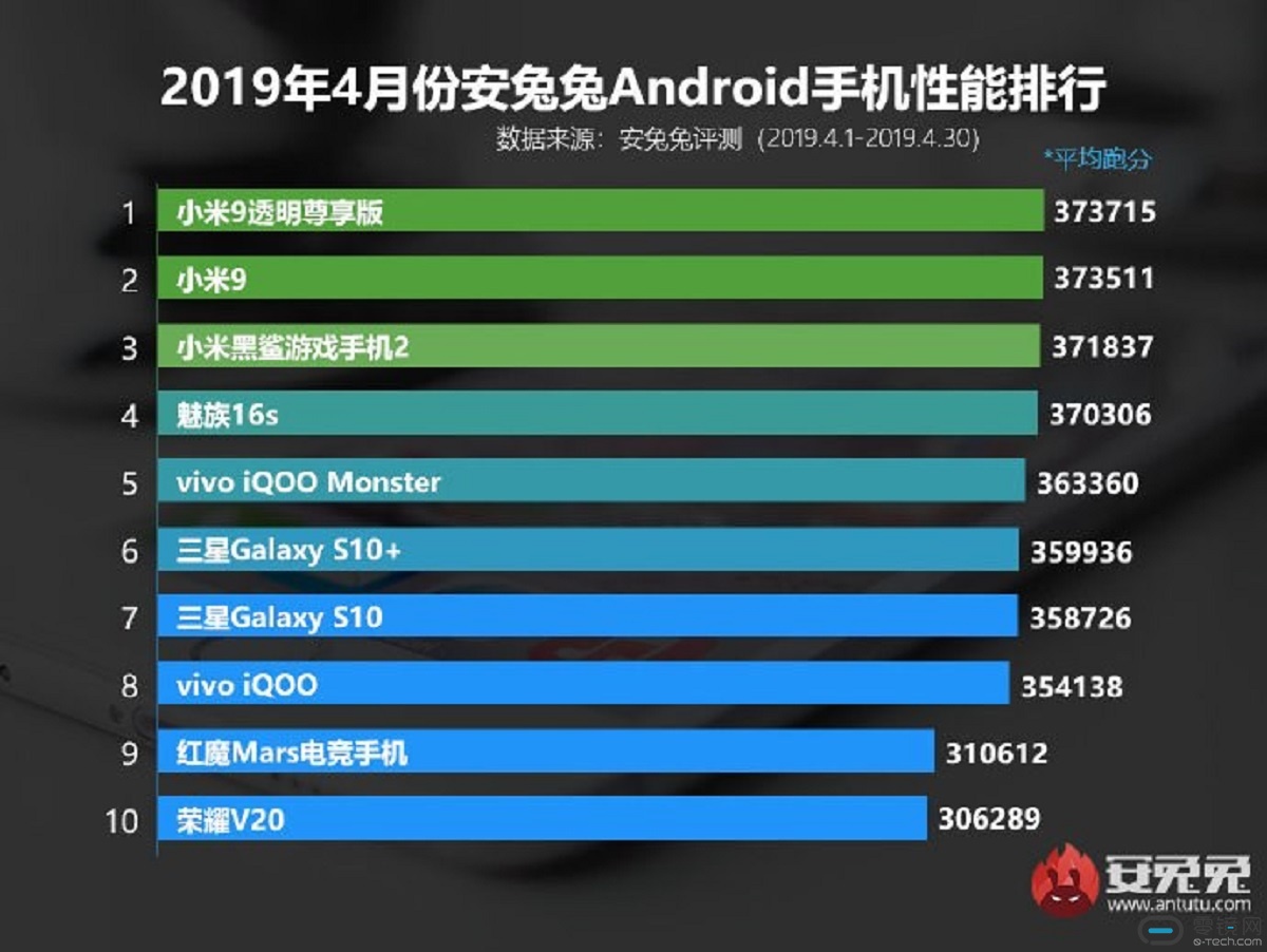 安兔兔在近日公布了2019年4月份国内Android手机性能排行榜。排名依次是小米9透明尊享版、小米9、黑鲨游戏手机2、魅族16s、vivo iQOO Monster、三星Galaxy S10+、Galaxy S10、vivo iQOO、红魔Mars以及荣耀V20。