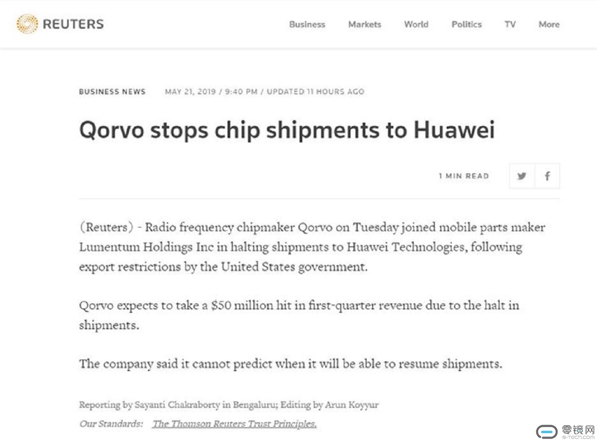 路透社爆料射频芯片制造商Qorvo、将按照美国政府的指令,停止向华为发货。由于出货量停止,Qorvo预计第一季度收入约5000万美元。而目前该攻速无法确认何时可以恢复出货。