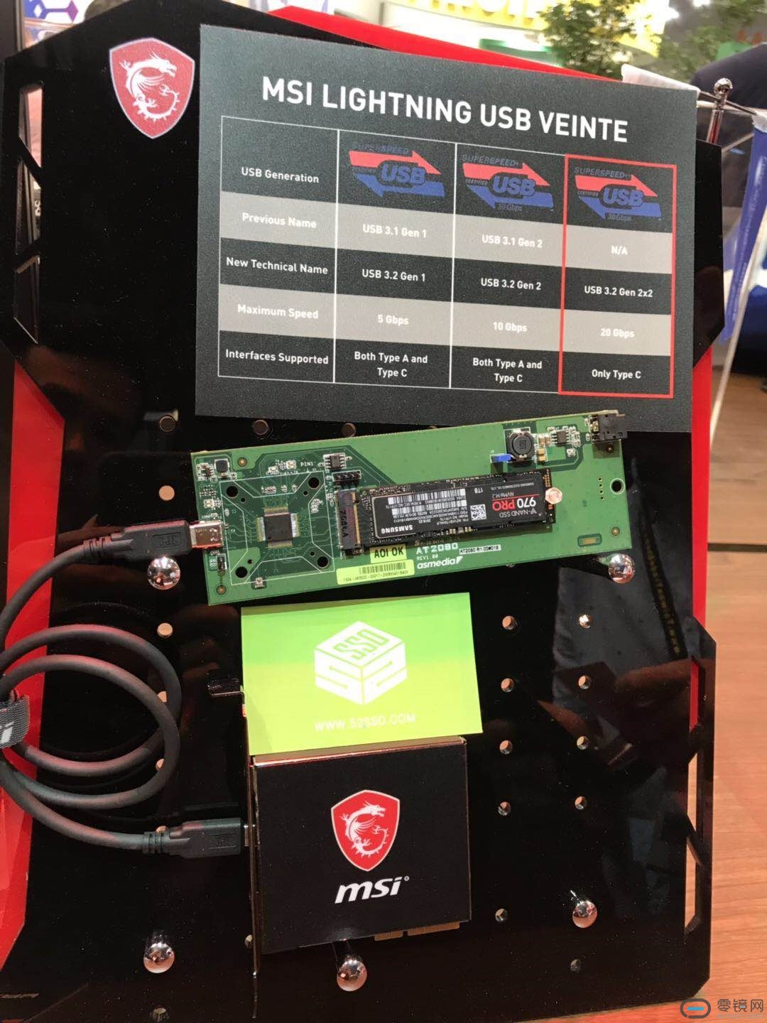 有媒体在台北电脑展期间发现,微星已经率先展示了一套USB 3.2 Gen 2X2 的设备。包含一个PCIE转接卡做主机(HOST),一个转接板做的USB 3.2 Gen 2X2 转NVME设备,推测为测试样品。