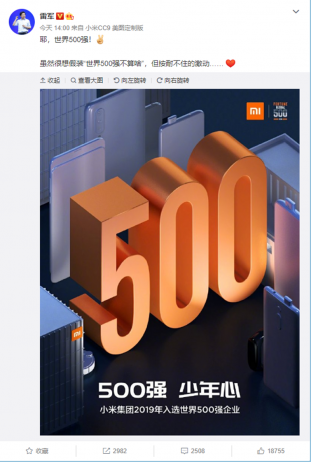 不过榜单发布不久,雷军就第一时间在微博上表示:“耶,世界500强!”。他还说,虽然很想假装“世界500强不算啥”,但按耐不住的激动……