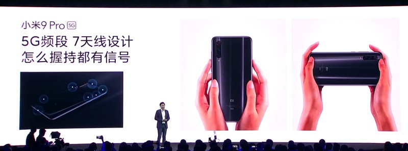 在这场以5G为名的小米发布会上,5G自然不可或缺。小米可以说是非常自豪地表示,小米9 Pro是目前国内已经上市的5G手机中,仅有的两款支持中国移动n41、中国电信n78、中国联通n79三频的其中之一。而7根天线的设计,也使得用户可以随心握持。