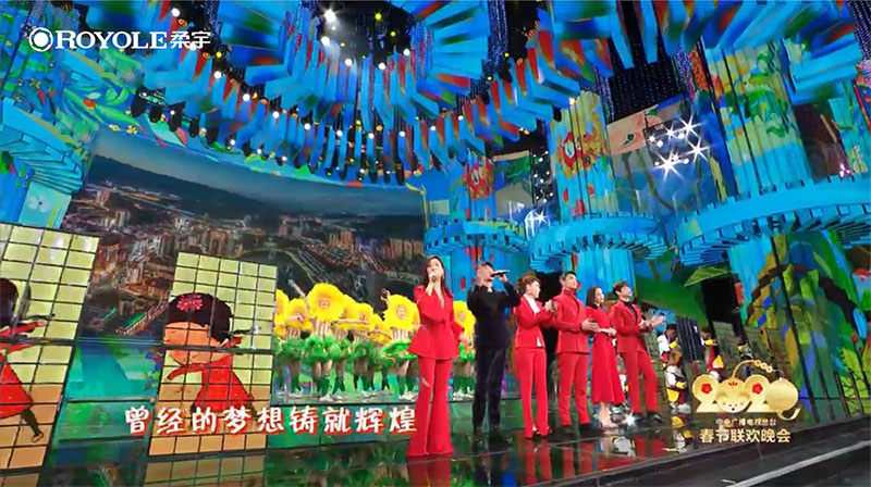 在2020年央视春晚主会场歌舞节目《锦绣小康》中,除了一众明星外,还有20名演出人员各手持一组柔性屏方格闪亮登场。近4分钟的演出时长内,柔宇的全柔性屏阵容共完成了20余种动态设计的全同步呈现。3D鼠年专属贺年灯笼、贴春联、挂花灯、气球……还有孩子们萌憨可爱的拜年模样,将零点的节日气氛推向了高潮。