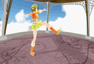 游戏开场,一个穿着超短裙的绿色系二次元萌妹摆好了跳舞的Pose,准备上演一段欢快活泼的歌唱+舞蹈。