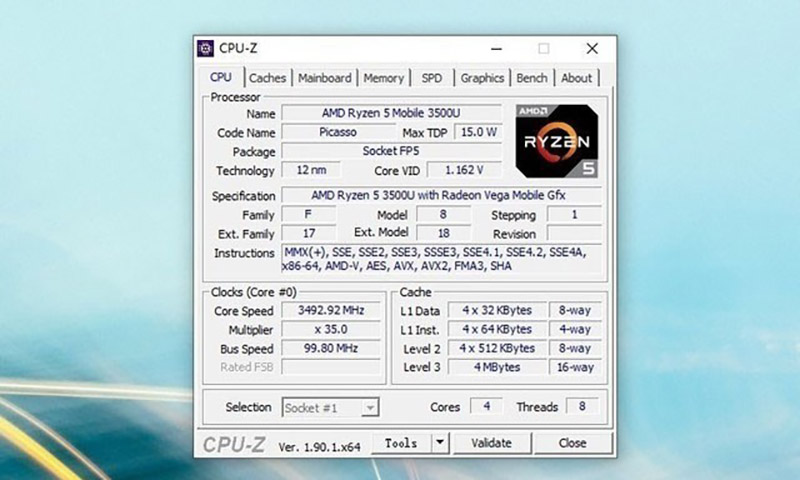 AMD锐龙5 3500U处理器是一颗4核8线程的处理器,TDP为15W,基于12nm制程工艺设计,三级缓存4MB,基准频率2.1GHz,最大动态加速频率3.7GHz。