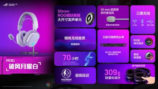 ROG破风「月耀白」新色登场,皎洁机身尽显质感,颜值更进一步。配备50mm ROG镀钛振膜大尺寸发声单元,搭配10mm超宽频吊杆麦克风,经过精心调校,提供出色音质。它还提供了三级可调弹性头带,透气网布耳罩,整体采用309g轻量化设计,佩戴更舒适。它支持三模无线连接,支持最高70小时续航,具备超低无线延迟,为玩家提供极致的无线电竞音效享受。