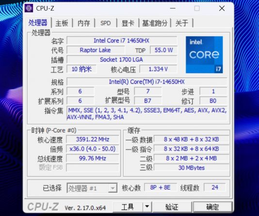 我们手上这台暗影精灵11基于成本和游戏应用的考虑,采用了性价比更高的英特尔第14代酷睿i7-14650HX处理器。这颗处理器采用Intel 7制程工艺,拥有8P+8E共计16核心24线程,拥有30MB L3缓存,最大睿频频率达到5.2GHz,TDP功耗为55W。虽然并非最新平台处理器,但其性能足以应对大型3A游戏与主流生产力任务,不会成为显卡性能释放的瓶颈。