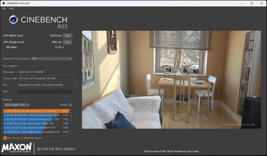 在体现CPU计算性能的CINEBENCH R23测试中,酷睿i7-14650HX单核得分1891,多核得分为23329,对于7K价位的主流游戏本来说,这样的CPU性能足以满足游戏和日常工作学习的需要。