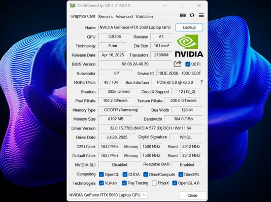 显卡方面,暗影精灵11配备了NVIDIA GeForce RTX 5060笔记本电脑GPU,其基于Blackwell架构打造,拥有3328个CUDA核心,搭配128bit 8GB GDDR7显存,设定功耗为115W,可以充分发挥显卡性能潜力。RTX 50系显卡支持DLSS 4的全部特性,特别是最高4倍的帧生成,能为大型3A游戏带来巨幅的帧率提升,从而在主流价位实现画质与帧数兼得。