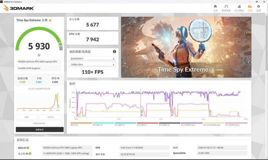 在体现显卡性能的3DMark基准测试中,拥有满血版RTX 5060笔记本电脑GPU的暗影精灵11表现不错。面向DirectX 12游戏的Time Spy项目综合得分达到了12646,Time Spy Extreme综合得分为5930。